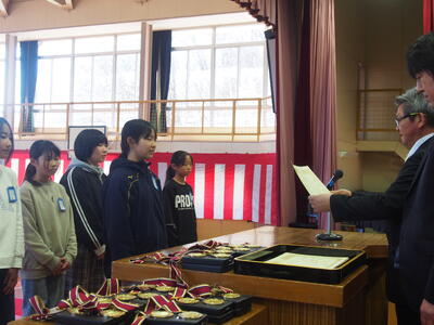 後援会表彰 投稿: 高久小学校 (03/12) 3月12日(木)に、卒業式予行練習後に、後援会表彰を行いました。全国大会出場のソフトボール部、県大会出場の野球部、栃木県小学生駅伝大会出場といった体育活動、また栃木県芸術祭児童生徒作品展、第56回下野教育美術展、河川愛護ポスターコンクールといった文化活動で、優秀な成績を収めた児童計22名を表彰しました。 Tweet 0 -