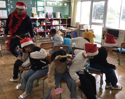 今日はクリスマス。せっかくなので、クリスマスソングメドレーで椅子取りゲーム!校長先生も参加してくださいました。いざ、勝負!!