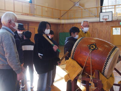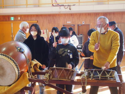 お囃子に挑戦! 投稿: 高久小学校 (11:04) 12月19日(金)に、高久地区お囃子保存会の方々に御協力いただき、お囃子に挑戦しました。はじめのうちは戸惑っていましたが、徐々に太鼓に慣れ、リズムよくたたくことができるようになりました。貴重な地域の伝統芸能に触れることができました。御協力いただいた皆様、心から感謝申し上げます。 -