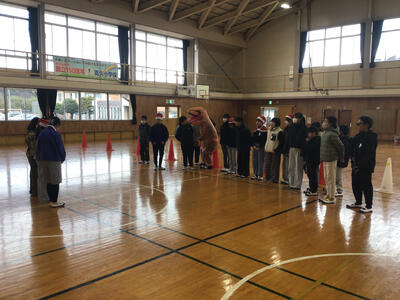 目隠しをして、音を頼りに相手を斬る「気配斬り」という遊びを行いました。柔らかい剣を使って、鬼に見つからないように慎重に逃げ回りました。斬られてしまった児童もスイカ割りのように、目隠しした鬼を誘導して盛り上がりました。