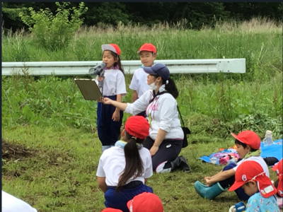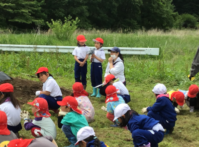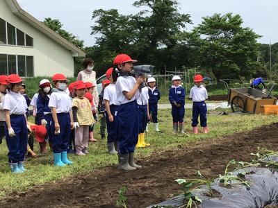 5月27日にサツマイモの苗植えを行いました。今年は、当日の司会進行やお礼の言葉も2年生が担当しました。また、2年生、1年生、年長さんを11班に分けて活動したため、2年生は全員班長として、指示を出したり並ばせたりと大忙しでした。