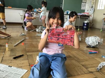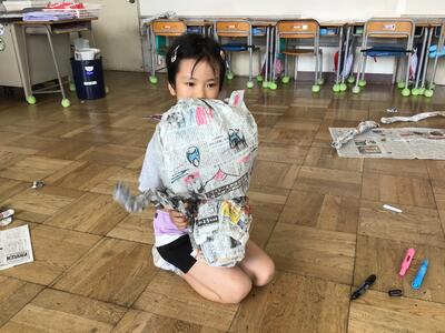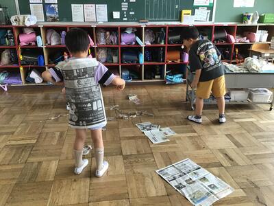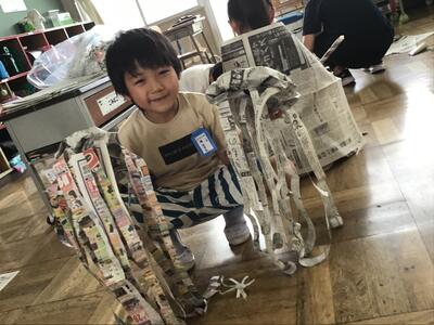子供たちは教室いっぱいに新聞紙を広げ、思い思いの作品を作っていました。