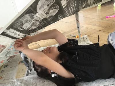新聞紙同士を繋げて、テントを作っています。中に入れる仕掛けがすごい!