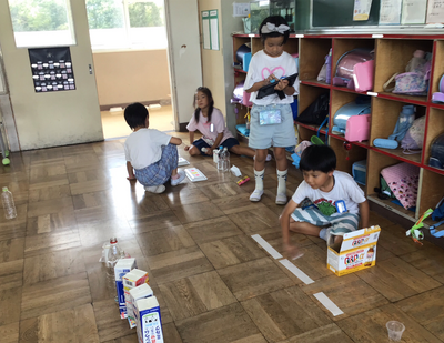 生活科「あそんで 作って くふうして」の学習で、空き箱やペットボトルなど身近にある物を使ってできる遊びを考えました。ゲームの名前や遊び方、ルールなども自分たちのオリジナルです。