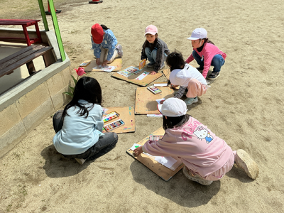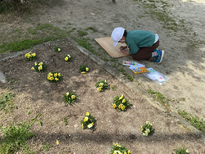 4月9日 春をさがしに校庭へ出て、春を見付けて絵を描きました。(図工)